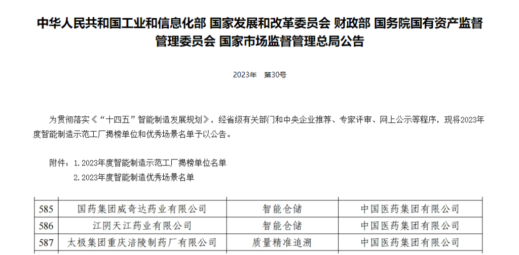 12月6日,工业和信息化部等五部门联合发布2023年度智能制造示范工厂揭榜单位和优秀场景名单。国药威奇达“智能仓储”项目成功入选2023年度智能制造优秀场景。