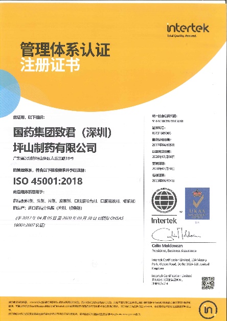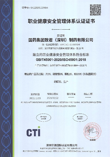 在国药致君党委书记、总经理黄艳同志及党政班子带领下,公司以习近平新时代中国特色社会主义思想为指引,认真落实党中央、国务院决策部署,高度重视员工健康工作,紧紧围绕“大卫生、大健康”理念,以实际行动提高企业全体员工健康意识,倡导安全、健康的生活、工作方式,引领国药致君和国药致君坪山构建健康安全环境,完善管理体系,两地均通过了ISO45001职业健康安全管理体系认证。